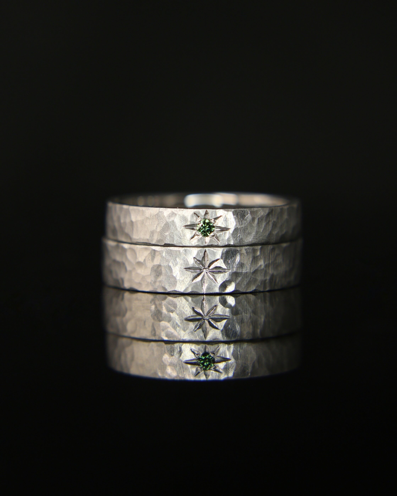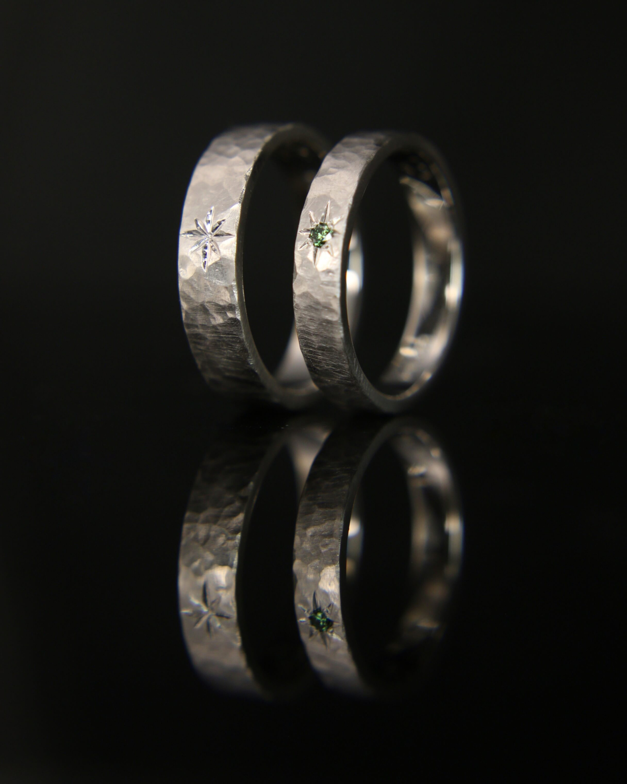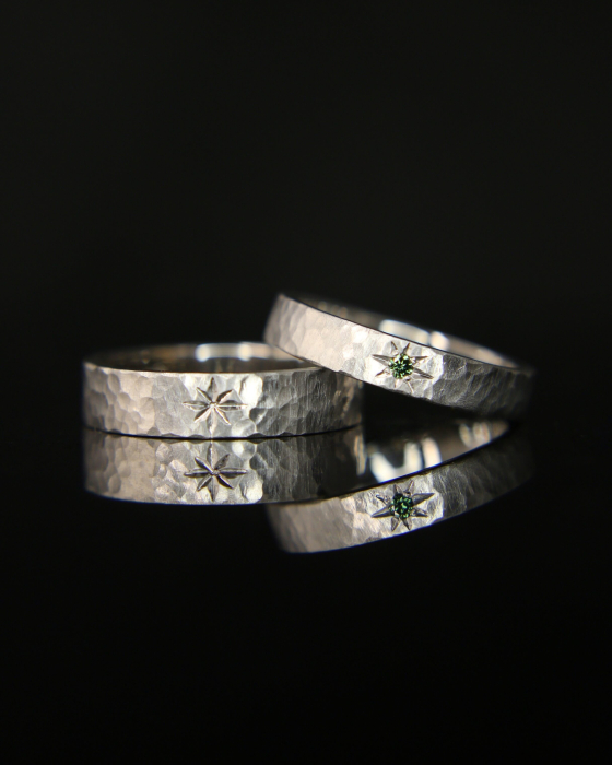 Verighetele "Luna Plus", realizate manual din aur alb de 14K, se remarcă prin textura unică obținută prin bătăi de ciocan. Acestea sunt împodobite cu un diamant natural de calitate superioară, fiind un simbol perfect pentru iubirea autentică și intensă, aducând cu sine nuanțe calde ce evocă delicatețea apusurilor și răsăriturilor.
